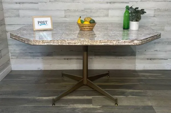 Vintage dining table. Formica marble effect. Great condition for age. Very heavy and sturdy. Comes with 1 removable leaf. Base has a few scratches. See pics. Width w/ leaf in - 58.5 Width w/out leaf - 41 Leaf width - 17.5 Depth - 41 H 8 - 29.5 Price- $125 located in Canby. No holds. Purchase directly through our website and view our inventory. Www.postfurnishings.com Text 541-490-6212 Dining room, mcm, mid century modern, kitchen, dinner table, retro