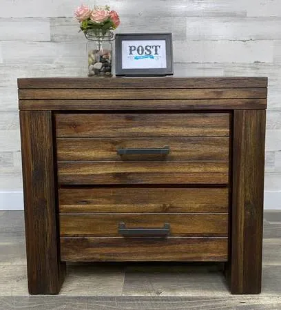 Rustic wood nightstand. Very well built and heavy. Drawers glide smoothly. Excellent like new condition. Only 1 available. Width - 27 Depth - 18 H 8 - 25.5 price-$150 located in Canby no holds purchase directly from our website postfurnishings dot com txt 541-490-6212 nightstand, end table, side table, postfurnishings