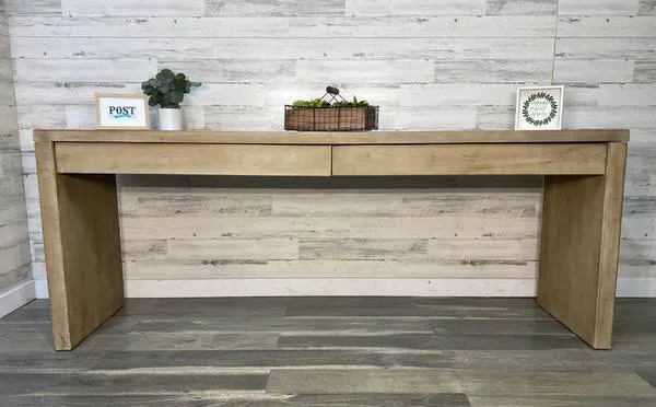 Pottery barn rustic “Prismo Console Desk” color warm rustic gray. Very sturdy simple rustic design. Only used for home staging! Has a few nicks on corners but goes with the rustic style! Great for entryway, sofa table, desk, or tv stand! Width - 80 Depth - 20 H 8 - 31.5 Price- $650 located in Canby. No holds. Purchase directly through our website and view our inventory. Www.postfurnishings.com Text 541-490-6212 Living room, office, modern, weathered wood, bedroom, buffet, table