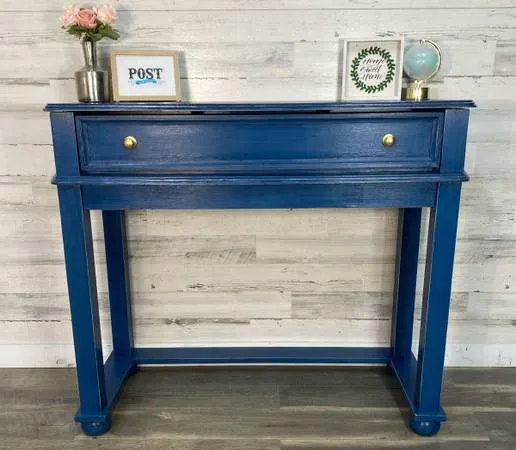 This very unique secretary desk has been refinished dark navy blue with gold hardware. The front openers to reveal a small but very functional desk surface. When closed it shows as a great sofa table or buffet! Width - 46 Depth - 18 H 8 - 37.5 Price- $250 located in Canby. No holds. Purchase directly through our website and view our inventory. Www.postfurnishings.com Text 541-490-6212 Desk, office, modern home, laptop, writing, entryway, sofa table, buffet,