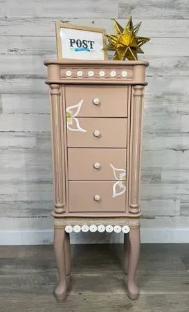 Refinished standing floor jewelry box. Soft rose pink with white and gold accents. Lots of storage! Top has a built in mirror. 15 x 10 x 38 tall Price- $120 located in Canby. No holds. Purchase directly through our website and view our inventory. Www.postfurnishings.com Text 541-490-6212 Bedroom, vanity, armoire, princess, necklace, ring, earrings