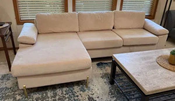 Cream white color sectional. Chaise can be moved to either side by flipping the cushion and moving the ottoman piece. Great condition with a couple small marks in the chaise area. See pics. Arm to arm - 100 Floor to seat - 19.5 Seat depth - 19 H 8 - 28 Chaise Depth - 41 Price- $300 located in Canby. No holds. Purchase directly through our website and view our inventory. Www.postfurnishings.com Text 541-490-6212 Modern style, sofa, couch, living room, mcm, mid century style
