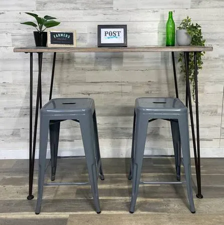 Rustic style bar table set. Table has been freshly stained and sealed. Comes with 2 metal bar stools. Table has hairpin legs. Very sturdy. Great for breakfast nook or patio bar! Table: Width - 47.5 Depth - 18 H 8 - 40 Set of 2 Stools: Total Width - 16 Seat width - 12 Depth - 16 H 8 - 26 Price- $195 located in Canby. No holds. Purchase directly through our website and view our inventory. Www.postfurshings.com Text 541-490-6212 Dining table, bistro, bar, nook, patio, porch, deck, sofa table