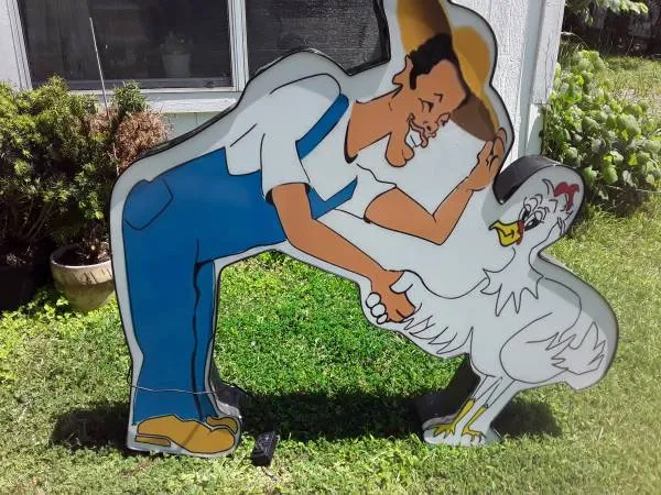 This Black Farmer and Rooster Lighted Sign will get anybodys attention. It is so detailed. It is Black Americana at its best. The face on the Farmer looks grateful and the rooster looks slick. It is not heavy for the size. Probably w 8 s about 10 lbs. The wiring is not heavy and the whole sign lights up. Great for small chicken business or a mans cave or womans cave, if there is 1. Call David at 817-357-1773 if interested so we can set an appointment and please leave a voice message if I ...