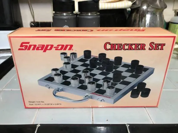 I have a New and Never been open or played Snap-On Checker Set Crown Premiums from 2003. It still has the original plastic and pad inside the box. It has been stored inside a closet all these years. The pieces are like sockets. Size: 10.25 L x 10.25 W x 0.85 H. CONDITION: New/Mint condition 650-766-1747 Please call me if interested, I will not response to emails and texts - they are usually spammers.