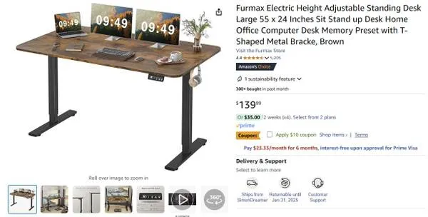 I have new and sealed in original box a Furmax Electric H 8 adjustable standing desk. Large 55 x 24 inches sit - stand up desk for home office computer desk with memory preset with T-shaped metal brackets. Brown in color. I purchased it by mistake and would cost much m 1 y to return it, this is why I am selling it at least than what I paid for it. Please call me if interested 650-766-1747 – leave a message if I do not answer and I will call you back. I will not response to emails and texts ...
