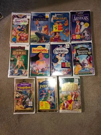 I have a collection of New and Sealed Walt Disneys VHS tapes. They are all sealed in original wrap and never been opened. You will get the following: Snow White and the 7 Dwarfs, The Lion King, Hercules, The Aristocats, Bambi, Pocahontas, Cinderella, Sleeping Beauty, The Jungle Book, Peter Pan, The Many Adventures of Winnie the Pooh. They have been stored inside a closet all these years. Please call me if interested 650-766-1747, I will not response to emails and texts - they are usually...