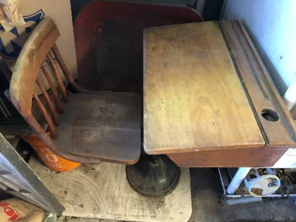 A childrens grammar school desk and chair chandler. Oak desk, oak seat and maple back on a cast iron base. The desktop opens up and has ink well. It is good condition for how old they are but will need work to bring back. It has been in storage for a long time and just never got around to restoring it. Measurements are in the pictures. Please call me if interested 650-766-1747, I will not response to emails and texts - they are usually spammers.