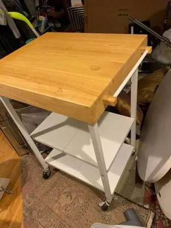 Wood top Rolling cart with 2 metal shelves, locking wheels and it folds for storage. Call or text Rick @ 404.229.1789 for more info. $150 Top measures 20 x 24 and it 36 high. Handle sticks out 1.5