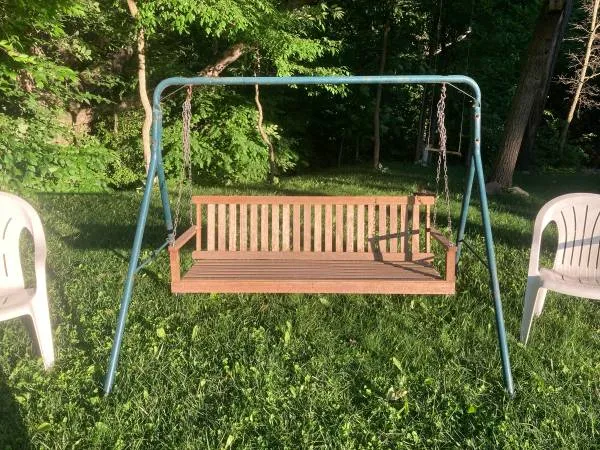 2 Seater; Hanging Wooden Patio Swing. In great condition, comes with the 2 chairs pictured. $100 obo. Text 309-360-9545 for pickup In Chillicothe.