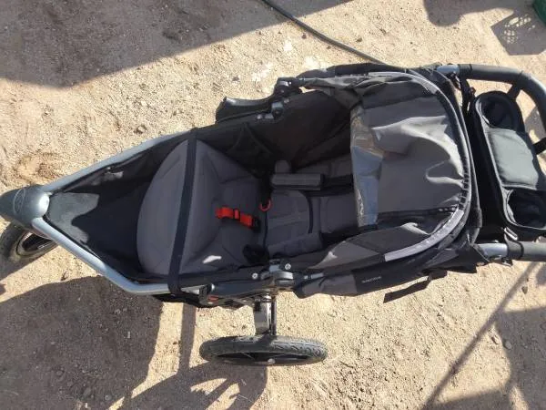 Very good condition. Lots of features, brake to keep from wheel straight if you want and then back wheel brakes also. Folds in half for transport. Extended sun shade, comes down quite far to keep sun off of your child. Cup holders, and a little pouch on top to hold small items. Basket underneath. Very sturdy and clean and tires are good. These strollers run $350-$550 new, $200 is a good deal. Call or text please. 520-440-4888 thx.