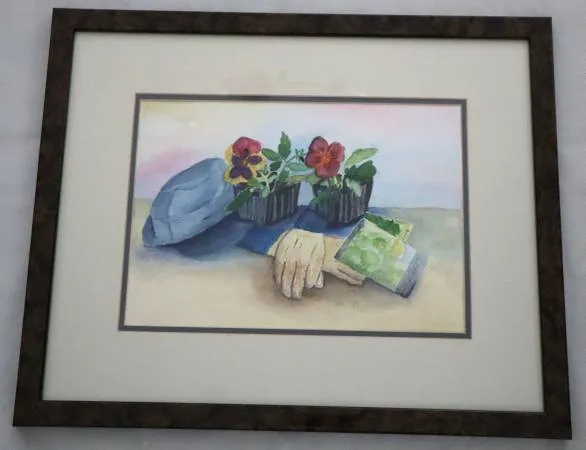 Gardening stuff Gloves, Flowers, Hat watercolor painting signed Gwen Williams good condition. Frame 21.5 x 17.5, e-mail me or text 303-949-1678. Cash only no delivery krbLsde vaha 3.5 L