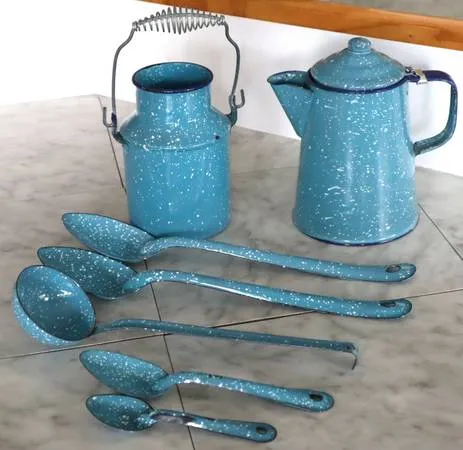 Used, chipped, some surface rust. Pail 7 H, coffee pot 8 H with top, 2 long spoons 14 L, ladle 12 L, 1 spoon 81/4 L, 1 spoon 6 L, e-mail me or text 303-949-1678. Cash only no delivery shldvkrbici 1.15 L