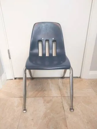 Classic classroom style chair USA made Navy blue with chrome frame 14 inch seat H 822 inch overall H 8 at top of backrest $10.00 cash 508-718-7157 Call or text Thank you Chairs seat seats kid kids child childs childs children childrens childrens tot toddler jr. Jr junior pee wee peewee mini miniature miniatures dwarf midget tiny retro genuine authentic old school pre preschool kindergarten elementary schools homeschool nursery homeschooling homeschooled ...