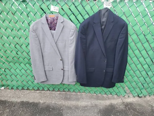 2 used expensive wool suits. Size 44 long jacket and size 38 pants. These were selling for $800 each at stores. 1 is blue the other gray stripes. 2 for $75. Great price. Cash.must Pickup sheepshead bay brooklyn . NO emails text only 347-554-5594