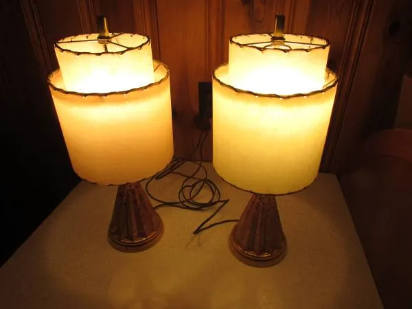 2 Vintage MCM Dual Tier Shade lamps. Pink with gold-t 1 flecks and gold-t 1 bases. They are 20 tall and the larger shades measure about 9 in diameter. The shades have a pink hue when the light is off. 1 of the larger 1 s seems to have faded a bit as far as being pink. Not noticeable when the lights are on. I dont believe the shades are fiberglass. New 9 watt LED bulbs. Im in West Irondequoit by the lake. Call or text 585-431-2478 or use Craigslist E-Mail.