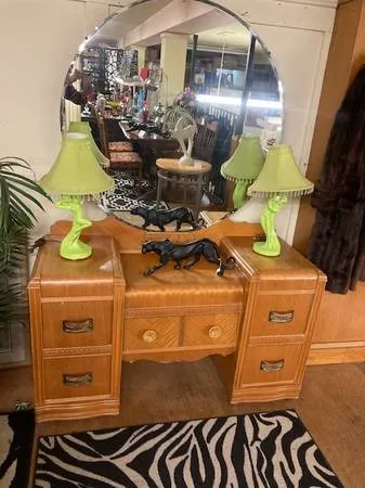 For Sale: Beautiful art deco Hollywood waterfall style vanity with round mirror. Circa 1930 s. The condition is amazingly very good, and the price is only $249.00. This fabulous art deco vanity can be seen at Yesteryears Marketplace Antique Store located at 433 Georgia Street, Vallejo, CA 94590. phone 707-557-4671. Please contact Bob at 707-557-4671 for more information and directions. Note: Our new hours are Noon to 5:00 PM, Tuesday through Saturday. Sunday hours are Noon to 4...