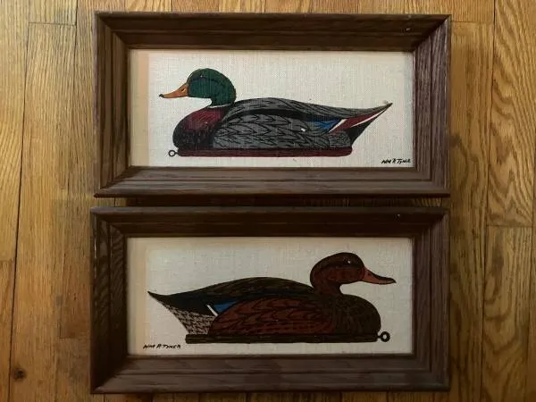 For Sale Wonderful 70 s VintagePairof William R. Tyner Duck Decoy Art Prints on Linen by Kay Dee mounted on sturdy oak frames measure 16 in length by 81/2 wide, both are in Good Condition. Perfect for the Duck Decoy collector or Cottage. Asking $35.00 for the pair. Interested Please Call 847-644-6199. See Posted Pics....Thanks for Looking!