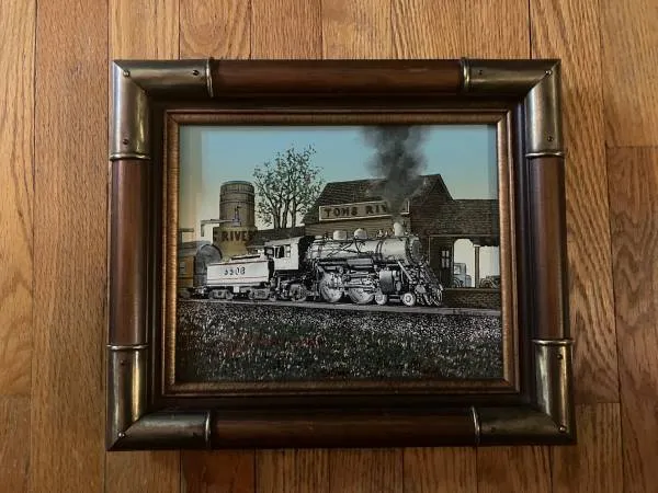 For Sale Stunning Acrylic on Canvas Painting buy H. Hargrove. Depicting a Classic Steam Engine stopping at a small town station called “Toms River”, this beautiful and vibrant image is 1 that would accent almost any home. It is signed by the artist on the rail track and is in spectacular condition. Beautifully Mounted in a 9 x 12 frame. Asking $25.00 Interested Please Call or Text 847-644-6199. See Posted Pic....