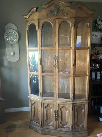 For Sale Vintage 1 Piece Hutch as seen in pics measures roughly 13 D x 40 W x 84 H.2 Glass Shelves 1 Broken and will need a replacement still have original piece glass just cracked in half. Asking $40.00 Interested Please Call or Text 847-644-6199. Have An Extra Piece of glass that may work if you can cut it to fit.