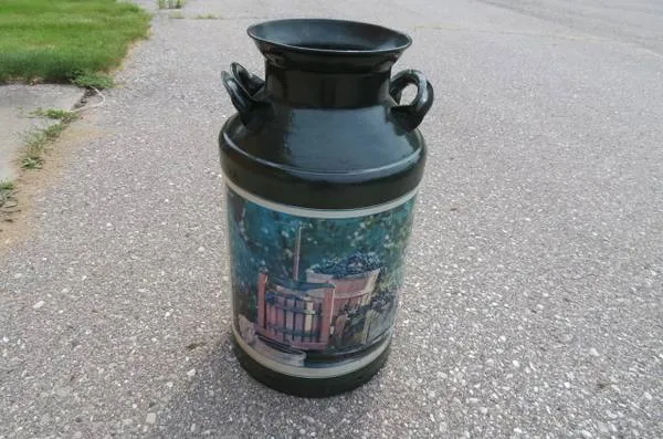 A 1920 s dairy milk can, with custom decoupaged image on all sides. 24 tall and 13 diameter. - $70 - CASH - FIRM - * I may meet halfway to deliver between Maple City and Traverse City. CALL 231-228-6218