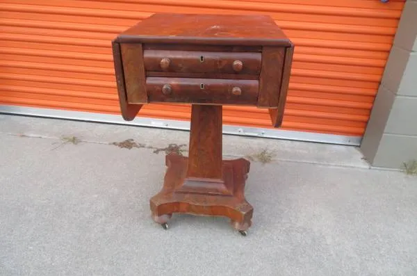 A unique 2-drawer work table. 30 tall x 19 wide x 18 deep. 38 wide with both drop leaves up. Top drawer has hinged writing panel. An antique furniture appraiser valued it at $400 - $250 - CASH - FIRM - NO ZELLE, VENMO, PAYPAL, OR CASHAPP CALL 231-228-6218