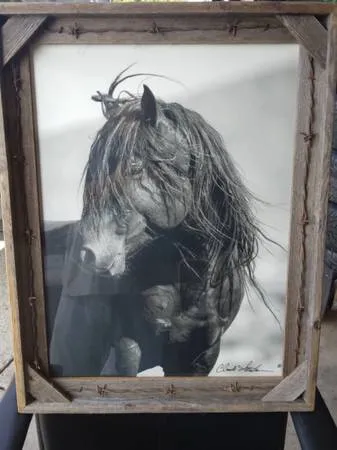 Nice Horse Picture in nice Wooden Barb wire Frame size 21 wide 28 tall $40 cash price call 193-756-4726 or call 193-756-4726 located in Brookville oh