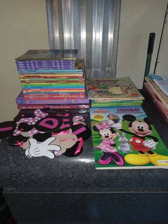 Very nice 32 books. 1 mini mouse birthday girl b day deco.. Cash price.TEXT 850-257-6295