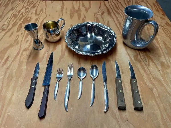 Silverware/Cup/Stein/Shot glass/Mug/Bowl/Knives/Silver/Camping/Kitchen Silver plated Forks 2, Spoons 2, Knife, Cup, Dish Pewter mug/ Stein Shot glass/ jigger Paring knives 3 Serrated knife $5.00 Call/Text ONLY 920-615-1980 will not respond to emails