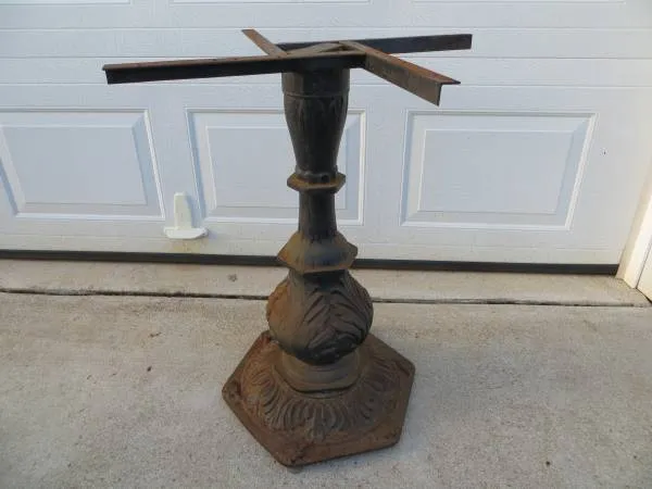 NICE ORNATE CAST IRON TABLE BASE. BRACKETS ARE WELDED TO TOP FOR CONNECTING TABLE TOP THOUGH THEY COULD BE REMOVED. $50.00 CONTACT JOE AT 609-617-7519