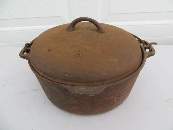 NICE OLD CAST IRON DUTCH OVEN WITH HAMMERED LID. 5 QUART, MADE IN THE USA. $30.00 CONTACT JOE AT 609-617-7519