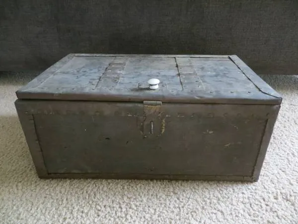 NICE UNIQUE FRANK MILLERS HARNESS DRESSING BOX. I BELIVE ITS FROM THE LATE 1800 s. WOOD AND EITHER COPPER OR BRASS CONSTRUCTION. 14 x 8-1/2 x 6 TALL. IT MAY BE HARD TO SEE IN THE PHOTOS, FRANK MILLERS HARNESS DRESSING IS ETCHED INTO THE WOOD ON SIDES. ITS ALSO ON FRONT OF BOX BUT WELL WORN. VERY SOLID BOX AS SEEN AND VERY COOL LOOK TO IT. $50.00 CONTACT JOE AT 609-617-7519