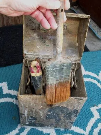Antique rustic metal or tin paint brush case. Includes paint brushes. Hinged lid. Needs a good cleaning. Decades of storage. Good prop or collectable. Measures aprox 8 length x 6 deep x 13 h 8. Pick up from North Aurora, IL. Please call or text 630-977-3882. If you email please include a number I can reach you at. Thanks for looking.
