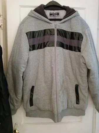 Mens Thick Fleece Hoody Coat; X Large, Fake Leather trim on pockets; front top; Fake fur inside hood; Clean & good condition; Cost new $60 saling for $7 Call only 314-337-7882