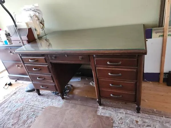 Large antique solid wood desk Tons of storage space. Very deep drawers. Thick glass topper $150 cash Call or text 941-284-9704