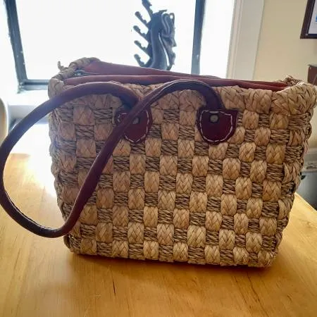 Handwoven Handbag from Morocco Bought about 25 years ago in Marrakesh. Unknown materials, though its likely coconut fibers or palm leaf fibers for the weave and camel leather for the closure and straps. The leather is a dark burnt orange color. ---------------------------------------------------------------------------------------------------------------------------- Im located at 501 W 110 th St. Craigslist email OK, but texts get a faster reply at 917-495-0690. Cash or Venmo.