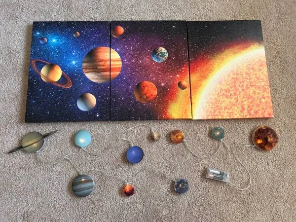 This wall art consists of 3 framed canvas planets depicting colorful stylized representation of space , with planets and stars against a cosmic backdrop. Call: 619-569-9995.