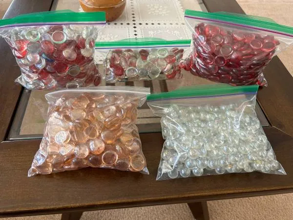 About 8 Lbs colors flat gems decorative glass st 1 s vase filler beads table scatter decor. Colors: transparent, red, gold, mixed red & More. Call: 619-569-9995.
