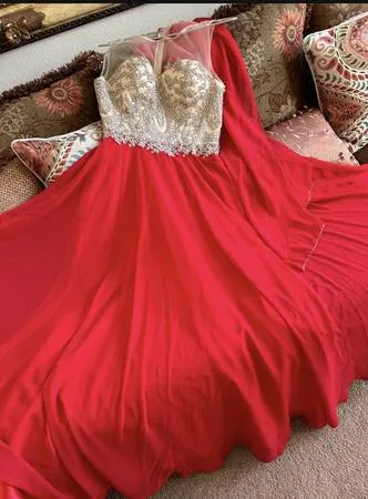 Size M. Stunning red gown with matching scarf. Lined with full slip. Excellent condition. Call: 619-569-9995.