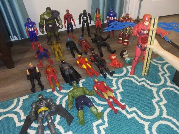 lot of 23 Action Figures All 23 REDUCED PRICE Total: $499 CASH only. Collection from 2001 to 2017 1/ 2016 Rare Marvel flash gordon wings and sound 2/ 2016 Marvel titan hero gamora 3/ 2014 Hasbro Avengers captain America 2 pc 4/ 2013 Hasbro spider man 5/ 2014 black spider man talking symbrote 6/ 2017 gladiator hulk ragnork talking marvel 13 inch and others. Thank you 832-541-4782