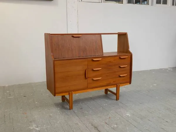 Sturdy teak hutch with a folding down top drawer. The inside drawers come with dividers and the shelf is adjustable in the larger section on the left. The legs on this 1 are gorgeous with some cool curves giving it a unique look. There is a spot on the top that has sanded through and there are some chips on the lower edges of the base. The price reflects this damage If youre interested call/text me 425-655-0519 Free delivery in tacoma Dimensions Length 48 ¼” Depth 15 H 840...