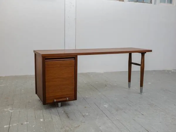 Very sturdy walnut desk with a tambour door that slightly smoothly. Behind the sliding drawer face is a set of dividers to accommodate a full arrangement of different storage needs. the top is a nice proportion of thickness to the rest of the piece which makes for a uniquely slender design The top has some scratches consistent with the age of the pieceapprox. 1960 and there is 1 slightly large ding which is as pictured If youre interested call/text me 425-655-0519 Free delivery in...