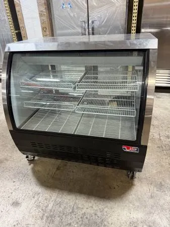 US 48 curved glass refrigerated deli case on casters, pre owned in like new conditions MODEL- USRDC 48 available for immediately pick up please call for pricing information or any other question phone 954-760-9333 www.lauroequipment.com
