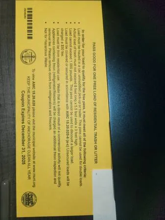 Discounted Dump Pass – Solid Waste Services I don’t own a truck anymore, but instead use my car for several smaller loads to the dump. Therefore, using this pass for 1 trip in the car is not an economical use of the pass. Offering it to some 1 who could use it for a full load, is a win-win for both of us. Expires 12/31/25 $15 Pick up near Muldoon/Tudor curve. Due to spammers, I will NOT respond to emails or craigslist voice messages. If interested please call or text. Leave a msg if needed - I will follow up. 907-227-3177
