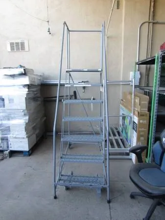 Used 7 step Uline rolling warehouse ladder. 24 wide, 70 to platform, 100 to top. $250.00. See at 1134 S. Park Ave, M-F 9-5, 520-623-7162.