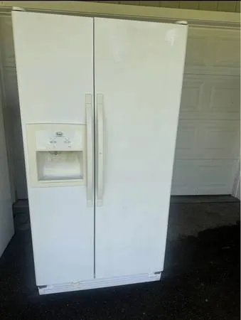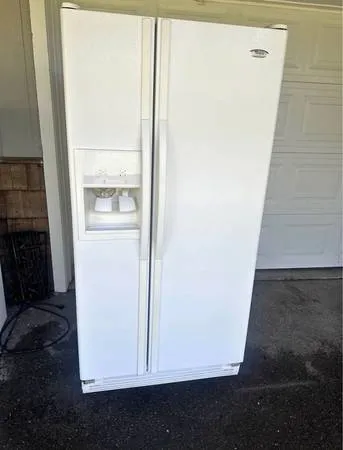 Whirlpool 25 cu ft side-by-side refrigerator/freezer with water and ice in the doorboth work great. This refrigerator is an excellent condition and works great. It is very clean and has no smells. It is 33 inches wide by 31 inches deep by 66 inches tall. If you’re interested, go ahead and message me thank you. 916-847-3262