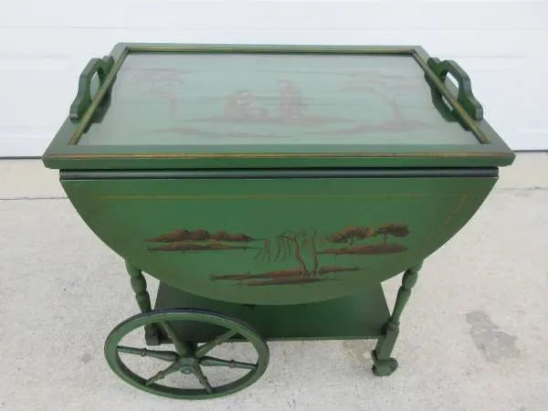 Asian Themed Tea / Bar Cart with Removable Glass Serving Tray Closed: 17 x 26 x 29 High 1 Side Up: 29 x 26 x 29 High 2 Sides Up: 41 x 26 x 29 High Good Condition! You can call or text me at 321-243-1439, to set up a time to see it. Click on more ads by this user to see all my Items for sale.