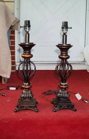 PRICE GETS 2 unique vintage style matching bronze lamps. No shades. 1 piece of a claw leg is missing. Electric cords look to be in good shape. Nice for bedroom. As pictured. Easy pick up a few blocks north of Roosevelt Road. Please CALL or TEXT 630-977-3882 or email and INCLUDE your phone number and I will call or text you. Thanks for looking.