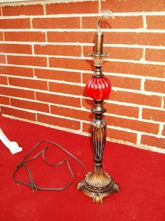 Unique vintage style lamp needing a new socket assembly and shade. Beautiful glass red ball decorative center. Electric cord is in good shape. Ceramic bronze color. Measures 6 wide x 6 deep x 23 h 8. Easy pick up a few blocks north of Roosevelt Road. Please CALL or TEXT 630-977-3882 or email and INCLUDE your phone number and I will call or text you. Thanks for looking.
