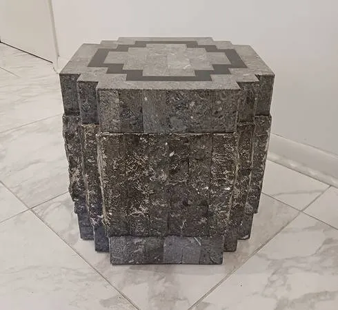 Exquisite postmodern and Brutalist-influenced pedestal from Magnussens 1990 Presidential Collection that features hand-tesselated fossil st 1 with a polished speckled gray top that has black and brass geometric inlays. Perfect accent for modern, eclectic, or minimalist spaces. Can be used as a plant stand, side table, lamp base, or sculptural display. Labeled and dated for authenticity. Originally purchased from Havertys Furniture. In very good vintage condition with light signs of wear. No damage. Dimensions: 15.5 W x 15.5 D x 21 H. NOTE: This pedestal is part of a matching set of 3 vintage pedestals Im selling from Magnussens Presidential Collectionsee group photo. Each pedestal is posted and priced separately but I will discount if youre interested in the full set. ** I prefer text messages 214-494-0595